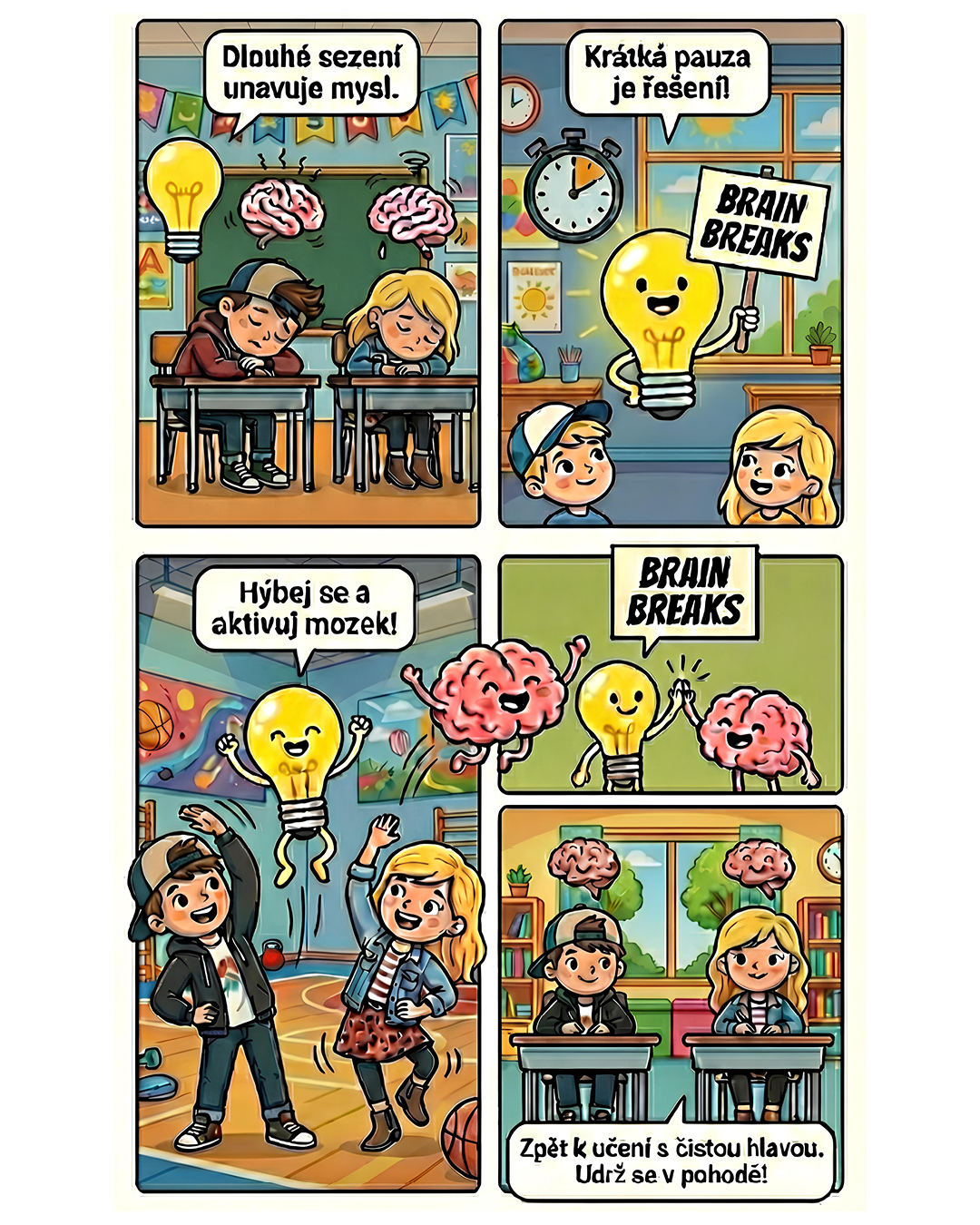 To důležité je, že princip funguje stejně ve škole i doma. Ve třídě pomáhá udržet rytmus výuky a klid. Doma pomáhá zvládnout úkoly bez zbytečných konfliktů, hlavně když je dítě po škole unavené. Pauza nemusí být nijak složitá – stačí dvě až pět minut: pár skoků, krátký běh na místě, tanec na jednu písničku nebo jednoduché pohyby, které zapojí celé tělo.